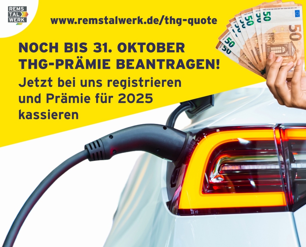 Wenn Sie ein Elektroauto besitzen, sparen Sie beim Fahren CO₂-Emissionen ein. Das wird mit einer Prämie für Treibhausgasminderung belohnt – und das jedes Jahr! Die THG-Prämie einfach HIER beantragen und Geld kassieren. Nach Prüfung und Freigabe durch das Bundesumweltamt zahlt das REMSTALWERK die Prämie auf Ihr Konto aus. Doch aufgepasst, wer sich die Prämie für 2025 noch sichern will: Die Antragsfrist endet am 31. Oktober!